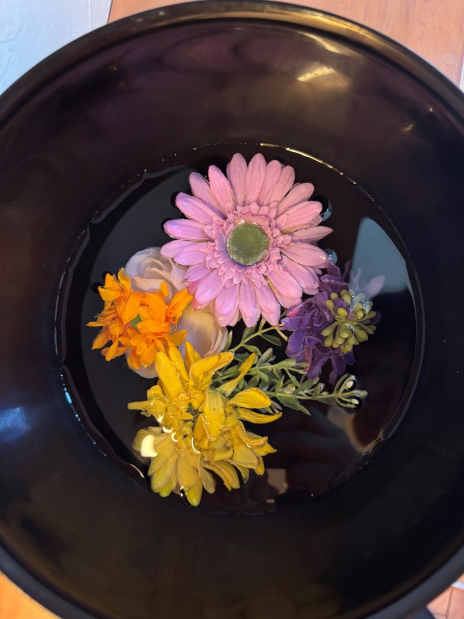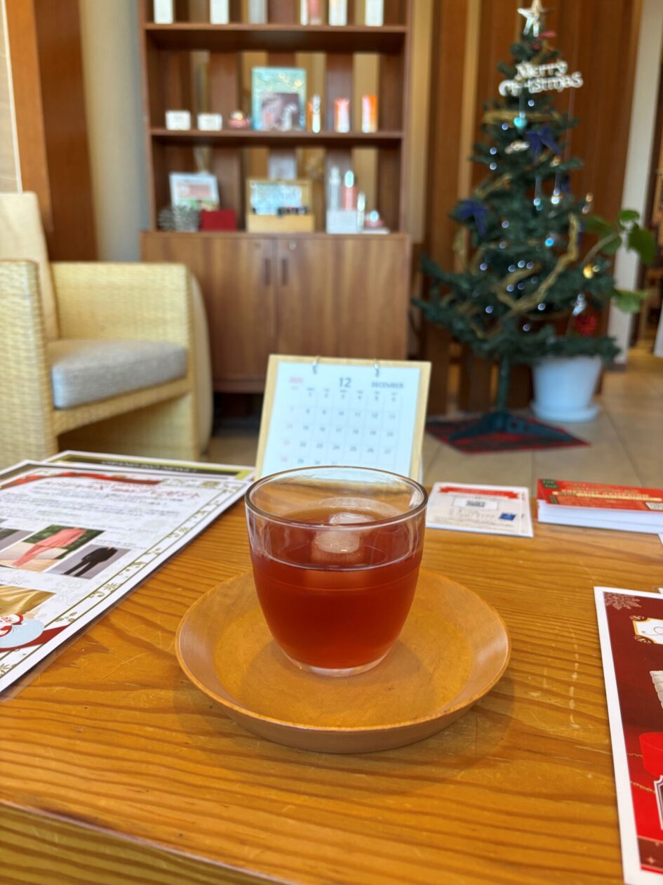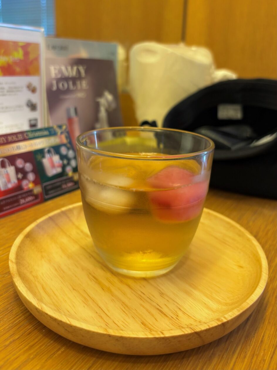 ウエルカムドリンクは、ローズヒップから抽出したエキスとエディブルフラワーのバラで作った氷が浮いているハーブティをいただきました。