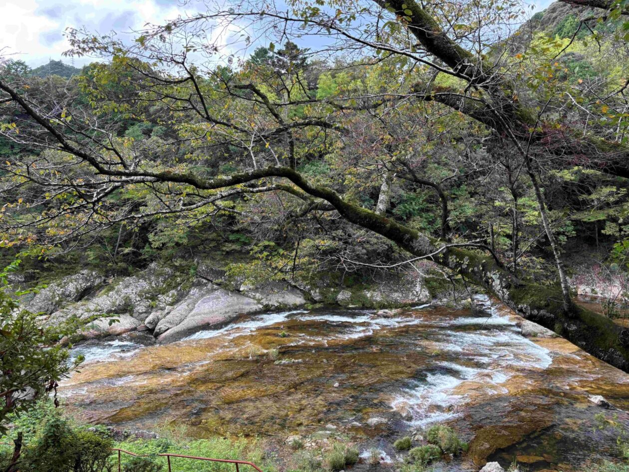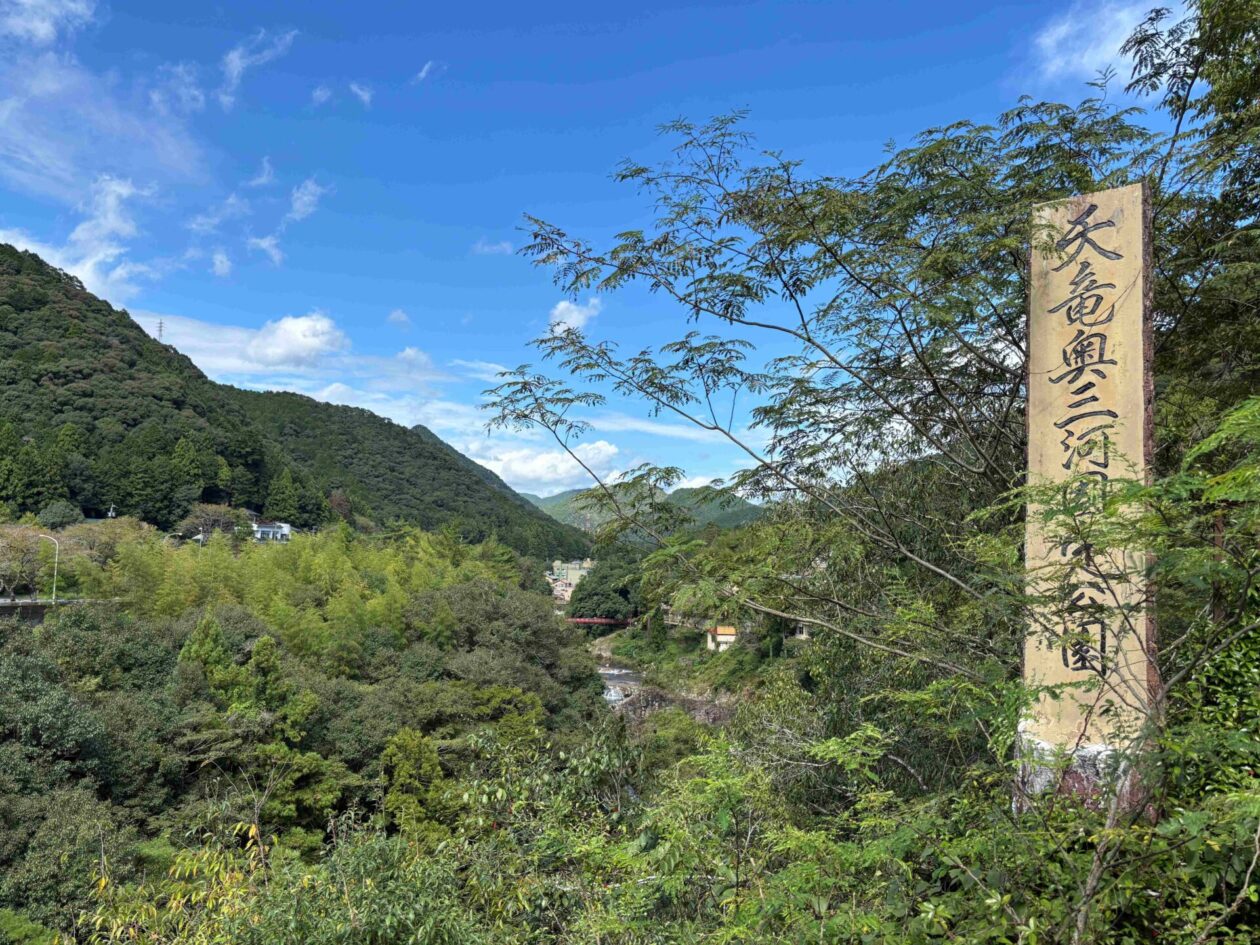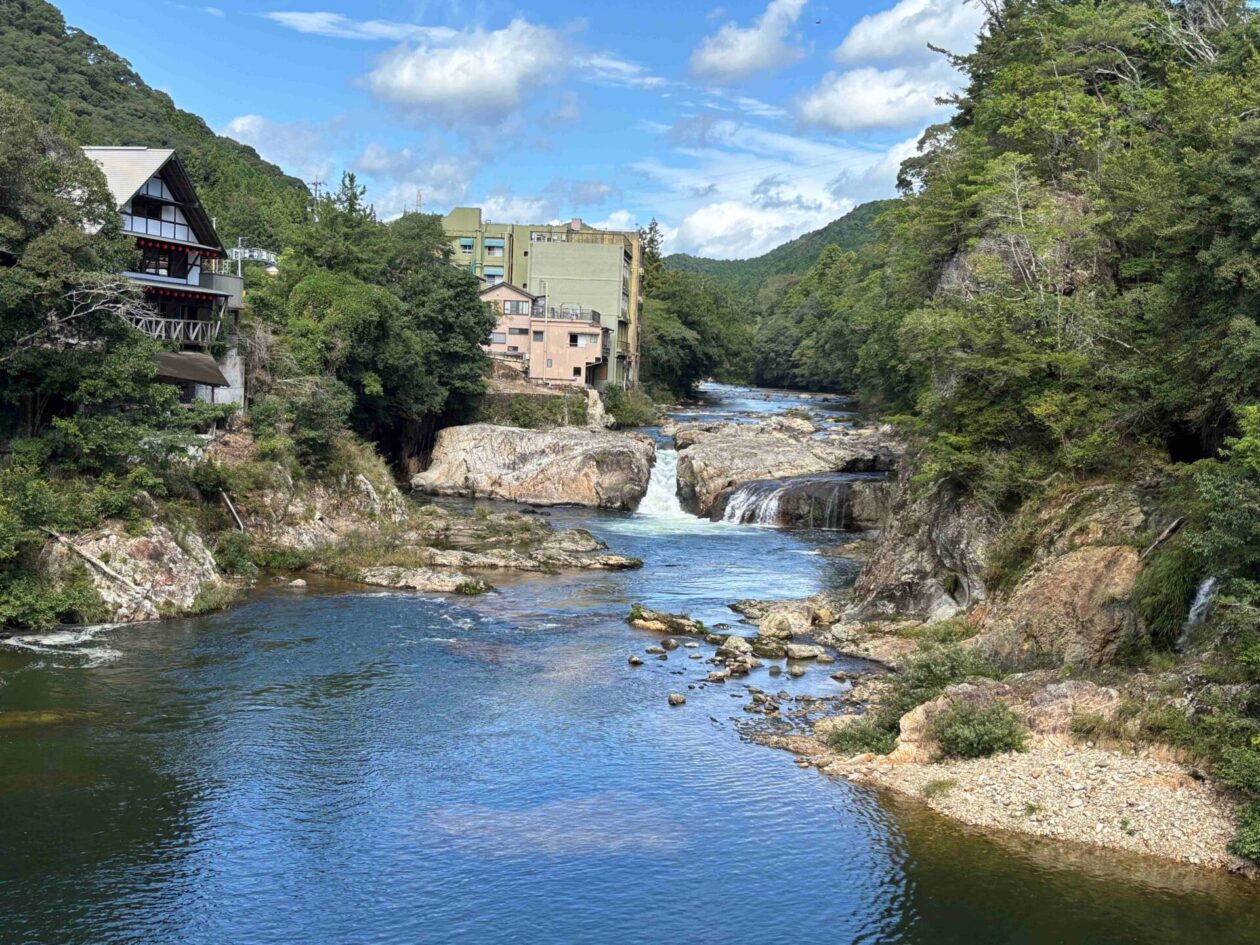 愛知県新城(しんしろ)市にある国の指定公園の鳳来峡(ほうらいきょう)にある湯谷温泉(ゆやおんせん)です。