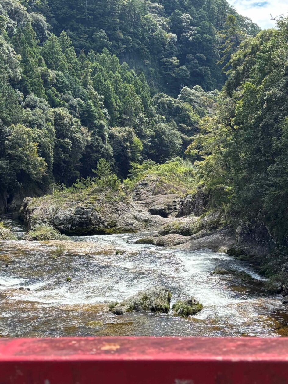 「湯の風HAZU」は露天でした。「はず木」の露天は板敷川とほぼ同じ目線にありましたが、「湯の風HAZU」の露天は高い崖の上にあり、板敷川と鳳来渓谷を上から眺めることができました。