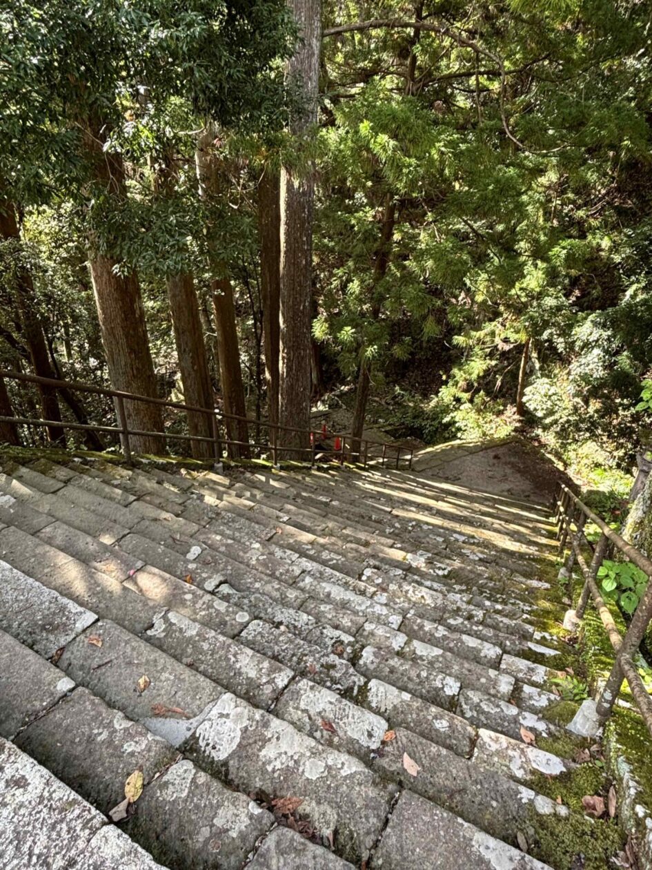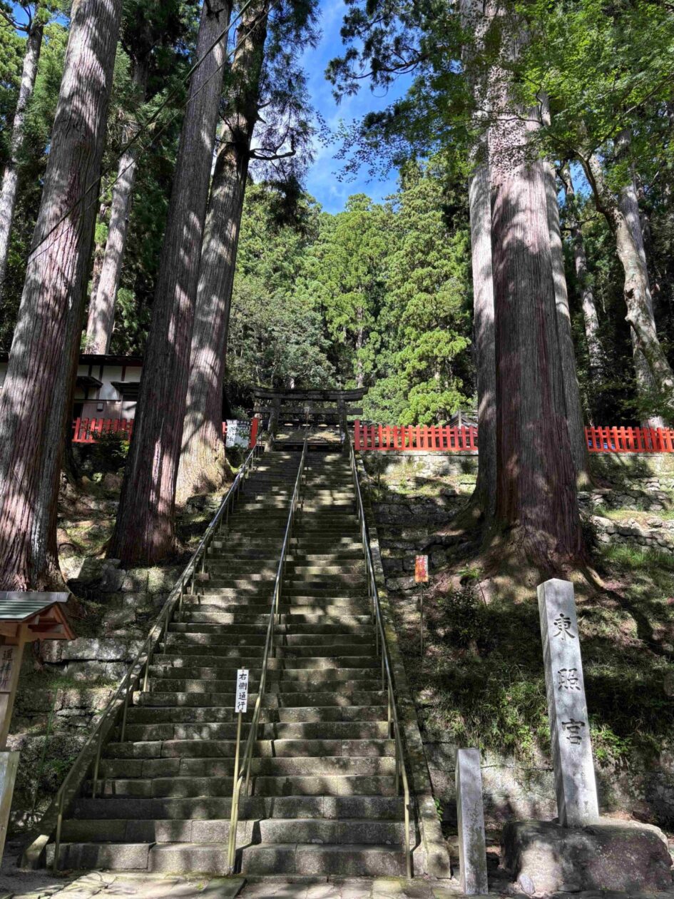右側の石段は、バスではなく、ふもとから鳳来寺へお参りする人のための長い長い石段。於大の方はこの石段を登って祈祷されたのかと思うと、よほどの願いを込めて家康の誕生を祈っていたのかを感じられるように思います。