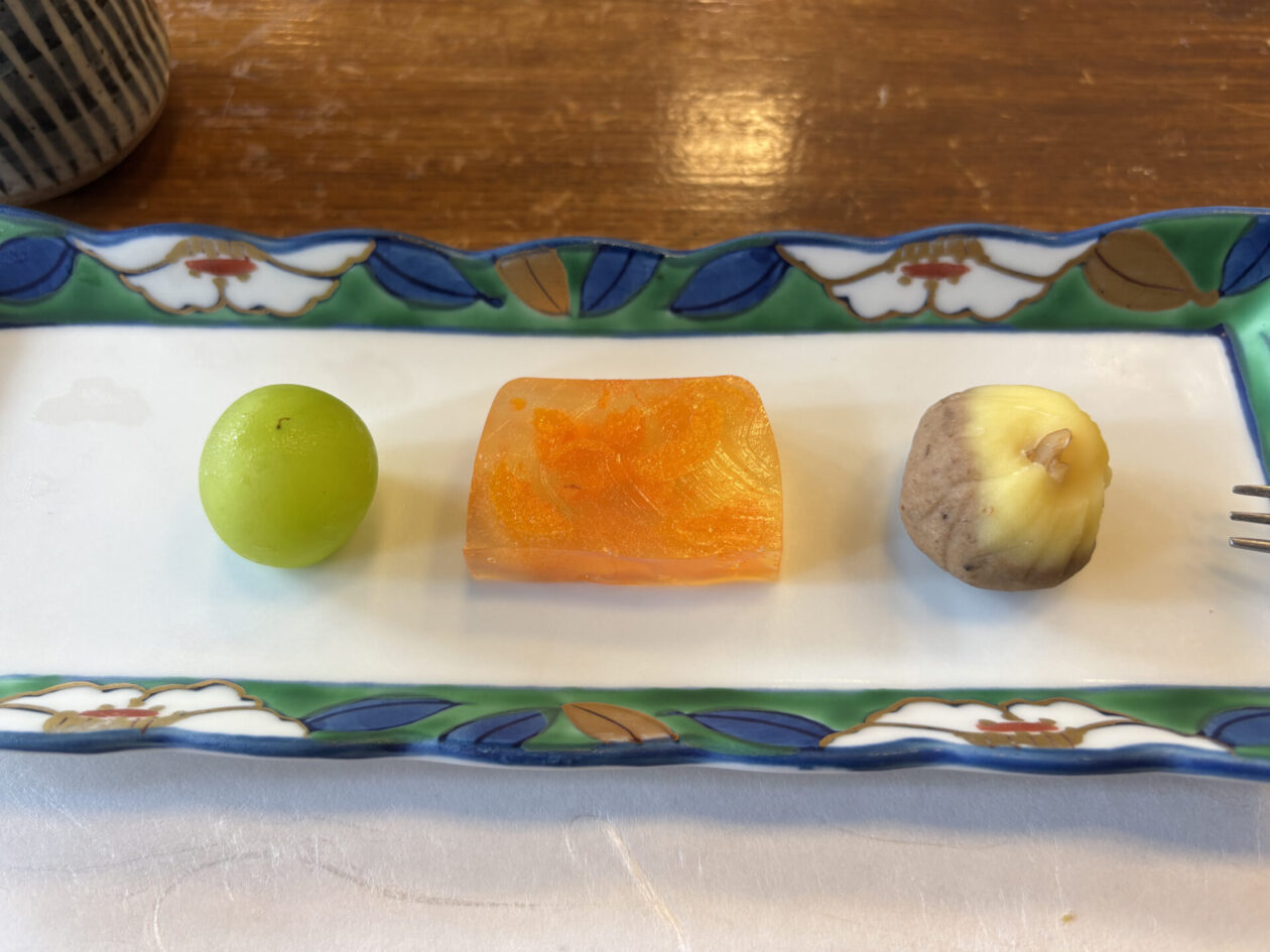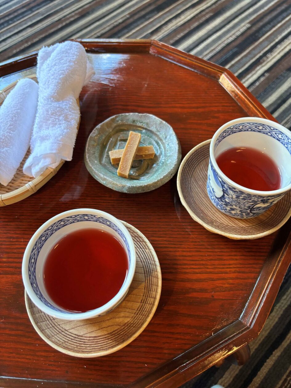 板敷川がすぐ横を流れています。早速、山査子のお菓子と薬膳茶で出迎えてくださいました。薬膳茶にはいくつか種類があり、体調や不調に合わせて好きなブレンドを選ばせてくれます。