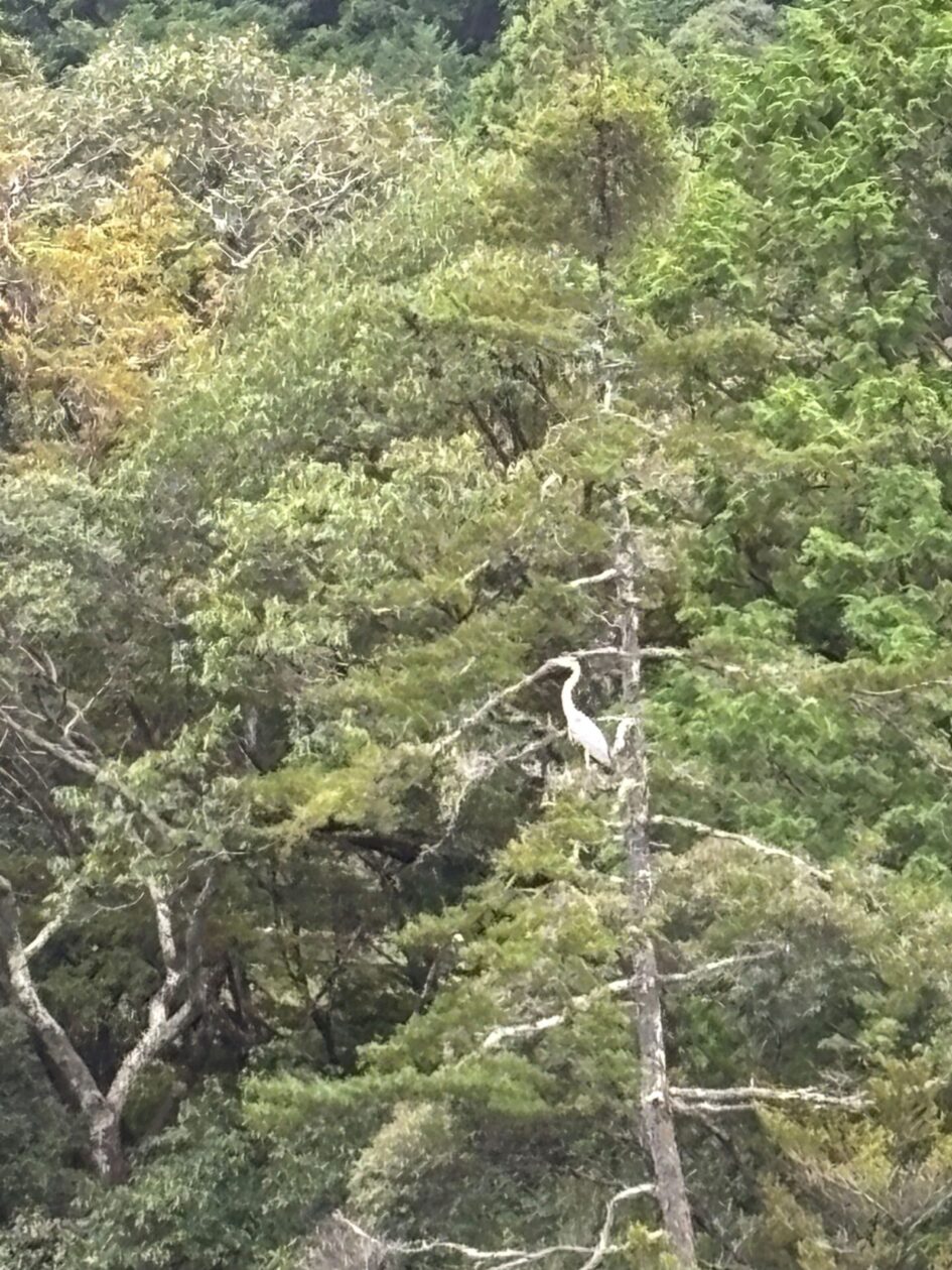 ランチの後、帰りの電車までの時間をロビーで過ごしていると、川向うの高い木にシラサギ?が舞い降りて、まるでご領地の見張りでもしているような様子で長い時間留まっていました。