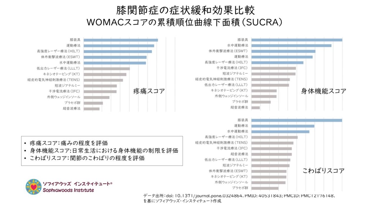 WOMACスコアの3つの評価の全ておいて、高い治療効果を示したのは、膝装具でした。また、運動療法と水中運動療法も3つの評価全てにおいて高い治療効果を示しています。