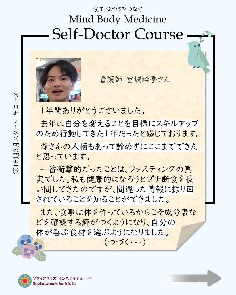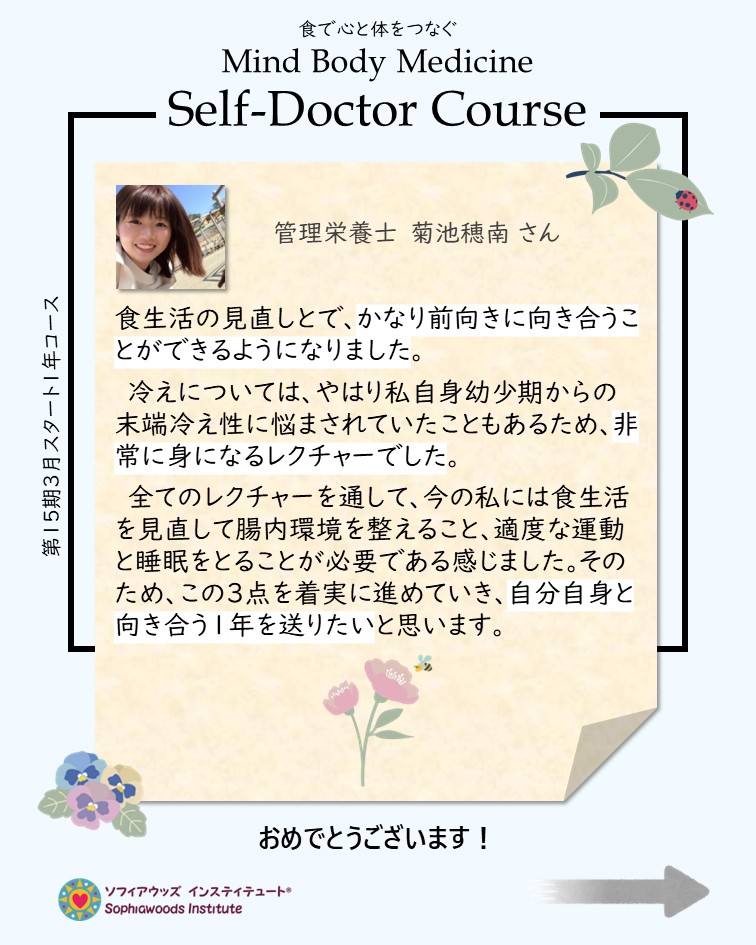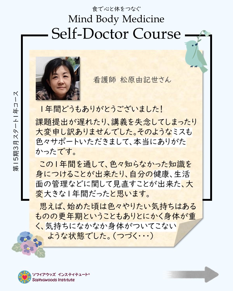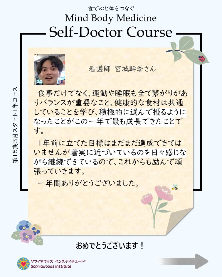 コース受講から得た知識を1年を通して実践してくださったことの成果が、それぞれの生活や心と体に現れていることが分り、とても嬉しく誇りに感じます。