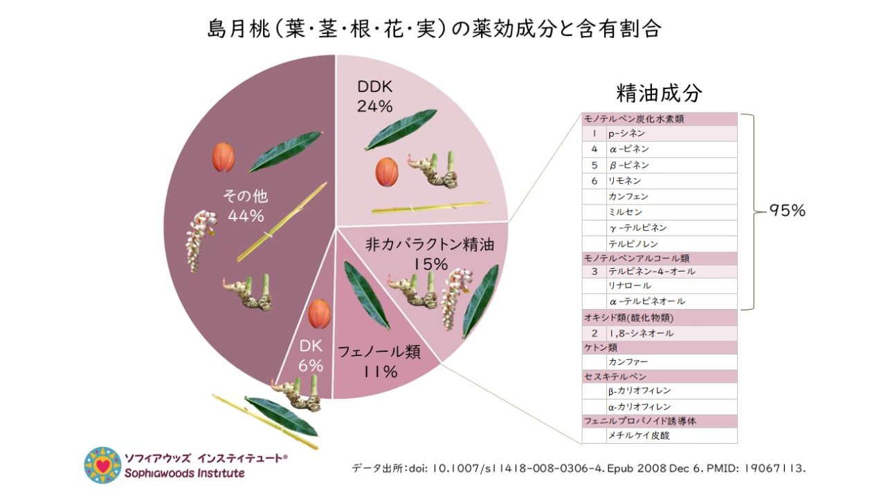 月桃の葉から水蒸気蒸留法で採取した精油から同定された17種の薬効をもつ化合物のうち、モノテルペンが95%を占め、最も多く含まれていました。