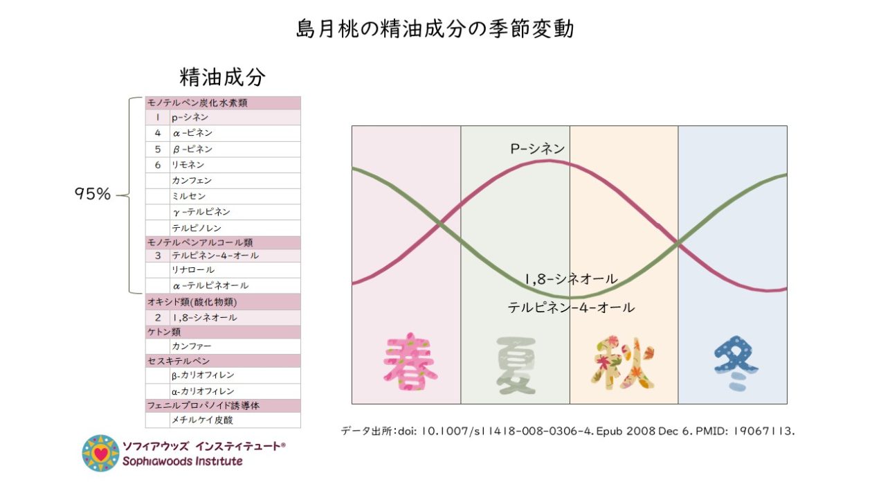 含有量トップ3のp-シメン、テルピネン-4-オール、1,8-シネオールは、季節を通して常に存在する優勢な成分でしたが、p-シメンは夏に多く、テルピネン-4-オール、1,8-シネオールは、冬に多くなる傾向があり、季節によって香り成分の含有量が変動することが示されています。