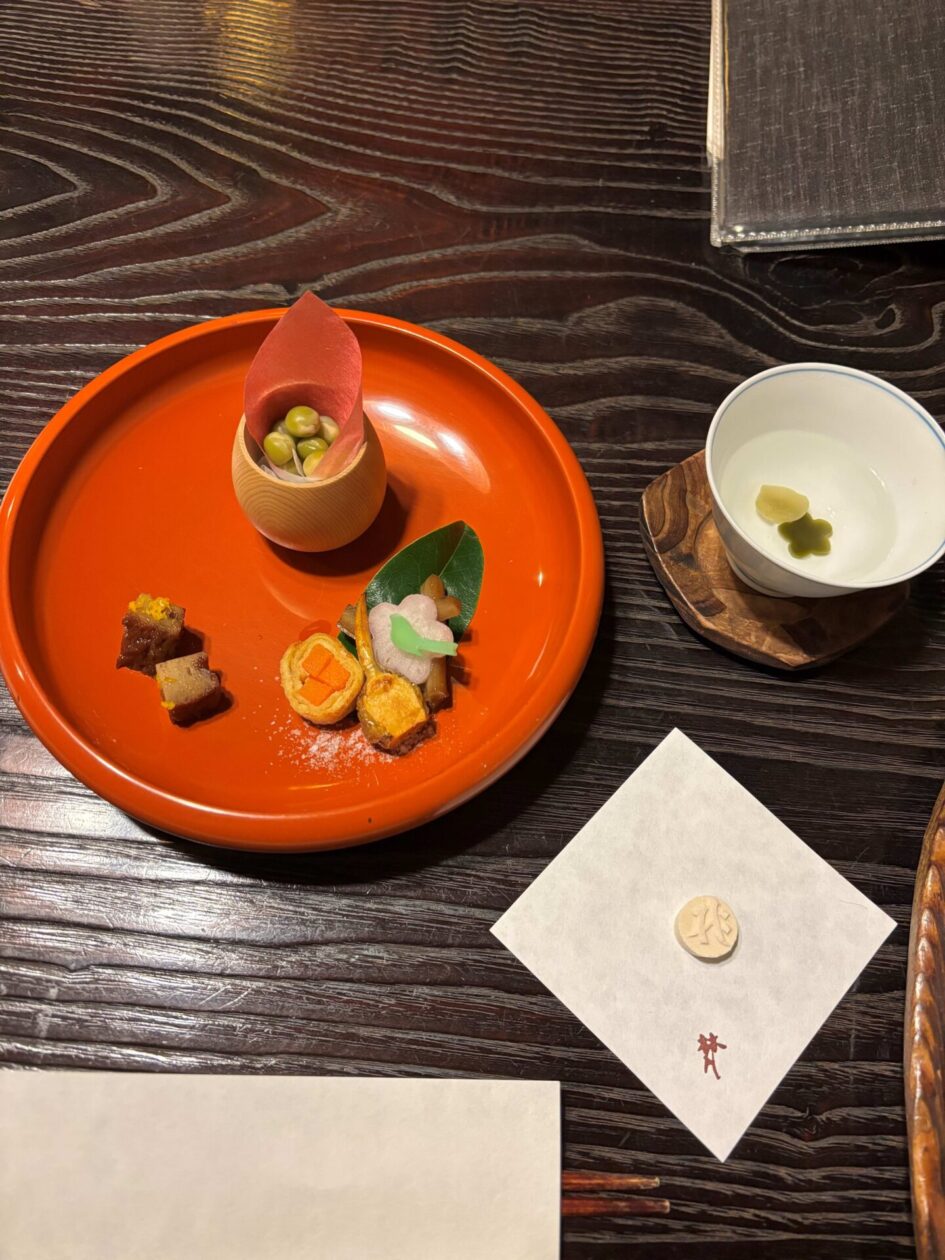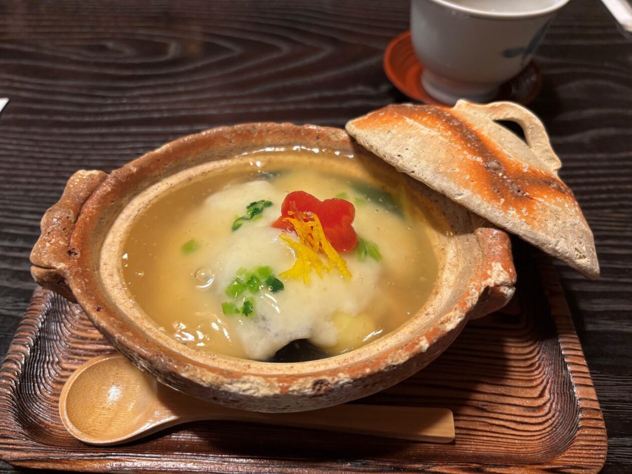 普茶料理の「丸」は「陽」、「三角」は「陰」です。陰陽がバランスされたお汁になっていました。