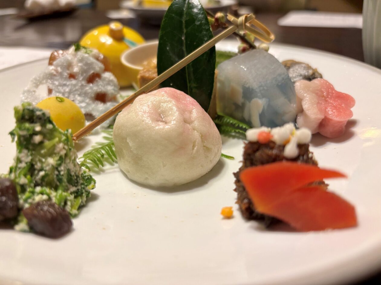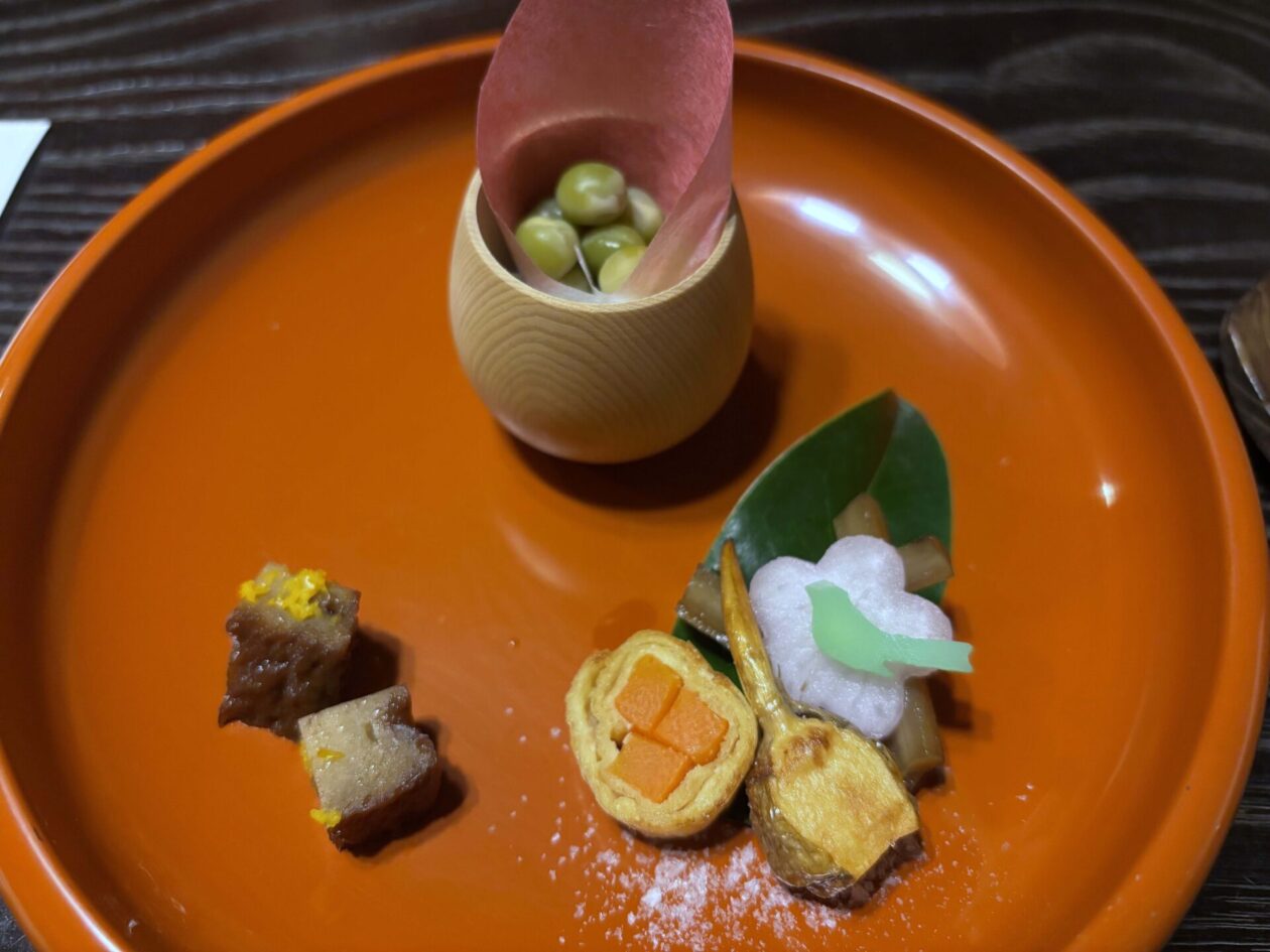 画面上は福豆です。左下の焼き豚のように見えるものは、お麩です。柚子の風味で美味しかったです。右下は、クワイを揚げたもの、人参を油揚げで巻いたもの、大根の梅の花の下はゴボウです。