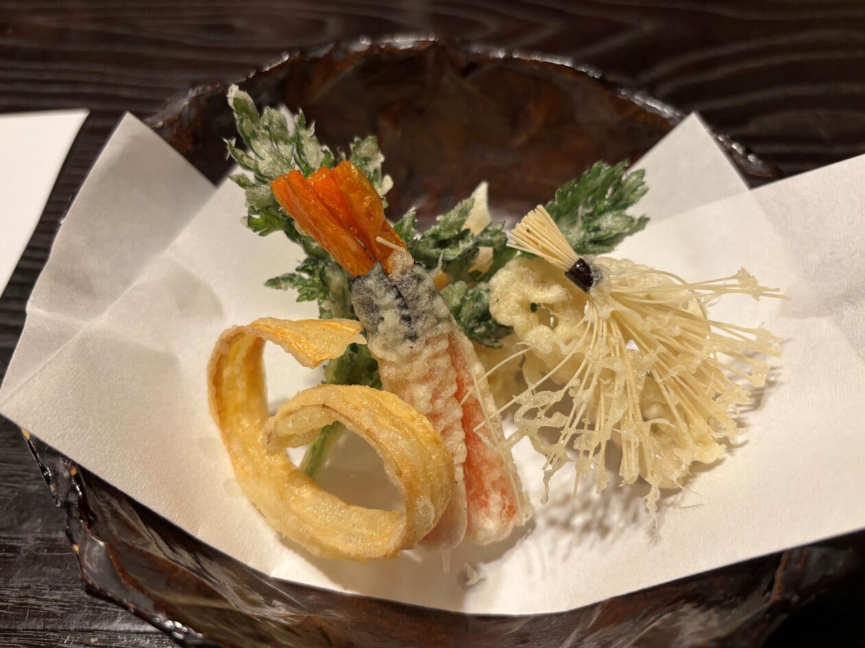 春菊の下には、こんにゃくとサツマイモの天ぷらもあります。人参が海老のようにしつらえてあります。